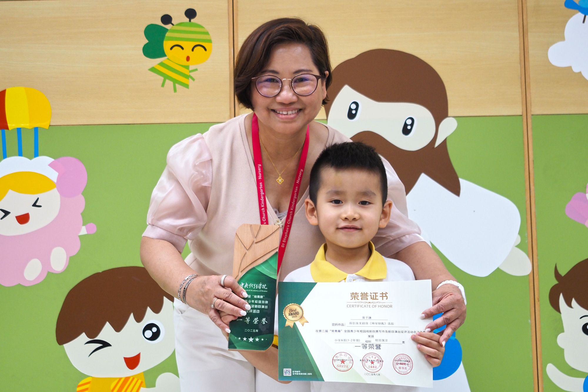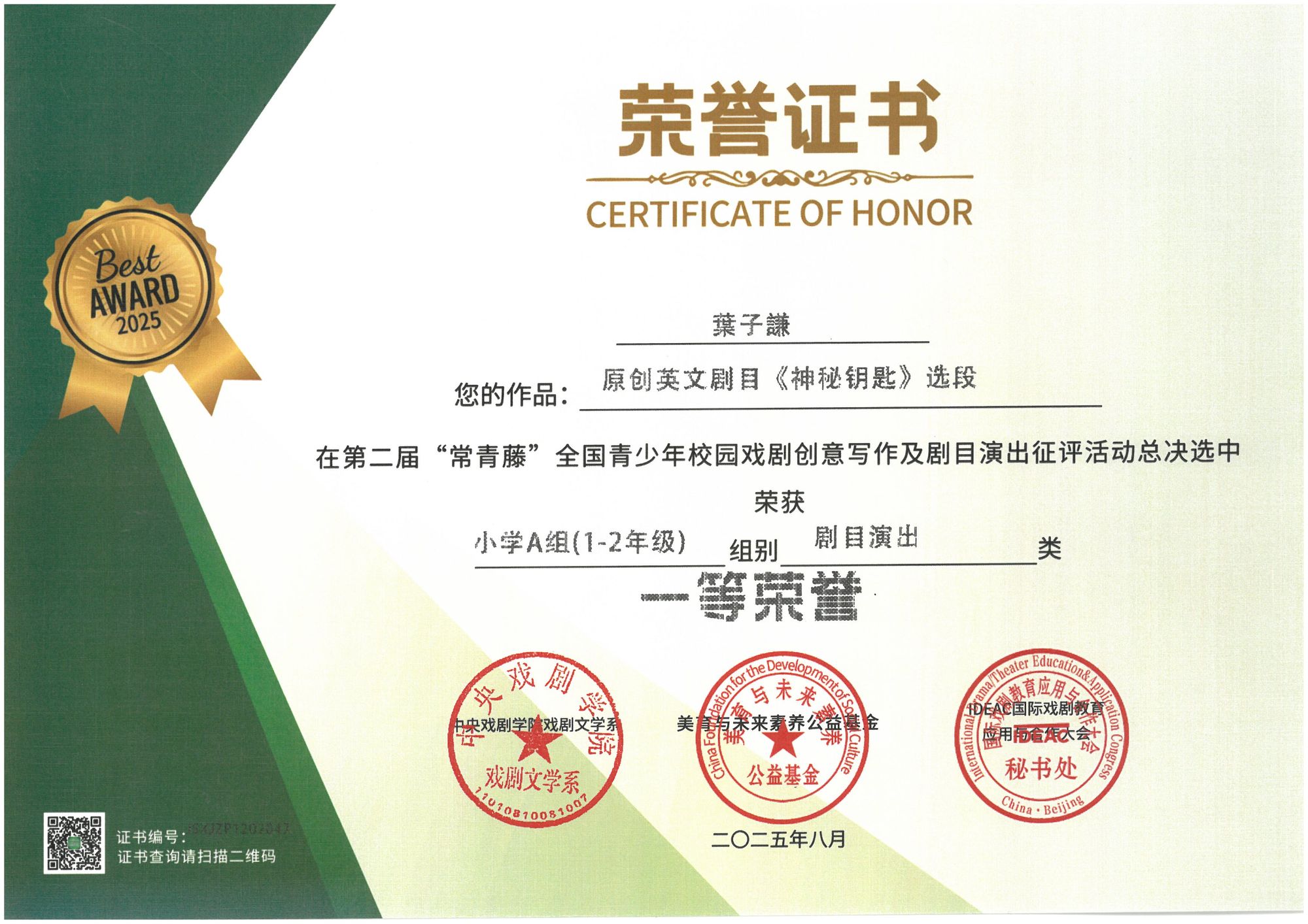 在第二屆「常青藤」全國青少年校園戲劇創意寫作及劇目演出征評活動總決選中葉子謙榮獲小學A組(1-2年級)組別劇目演出類一等菜譽