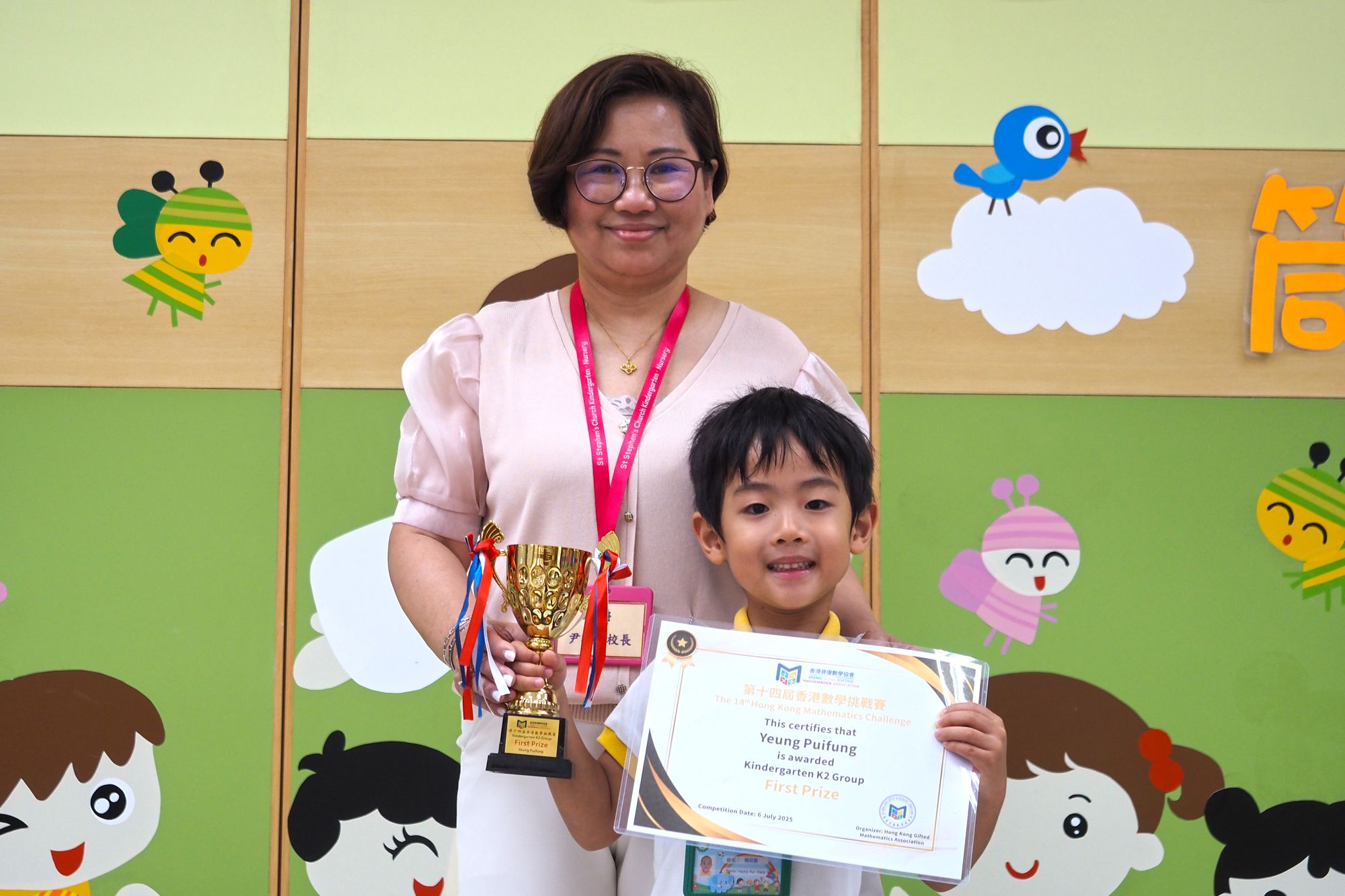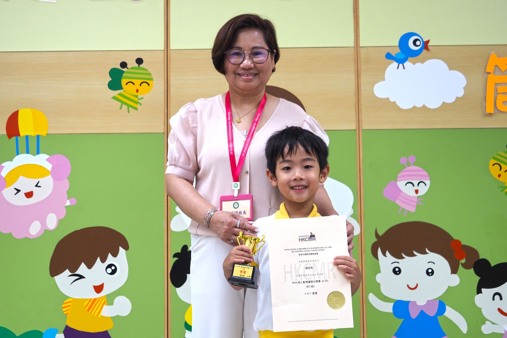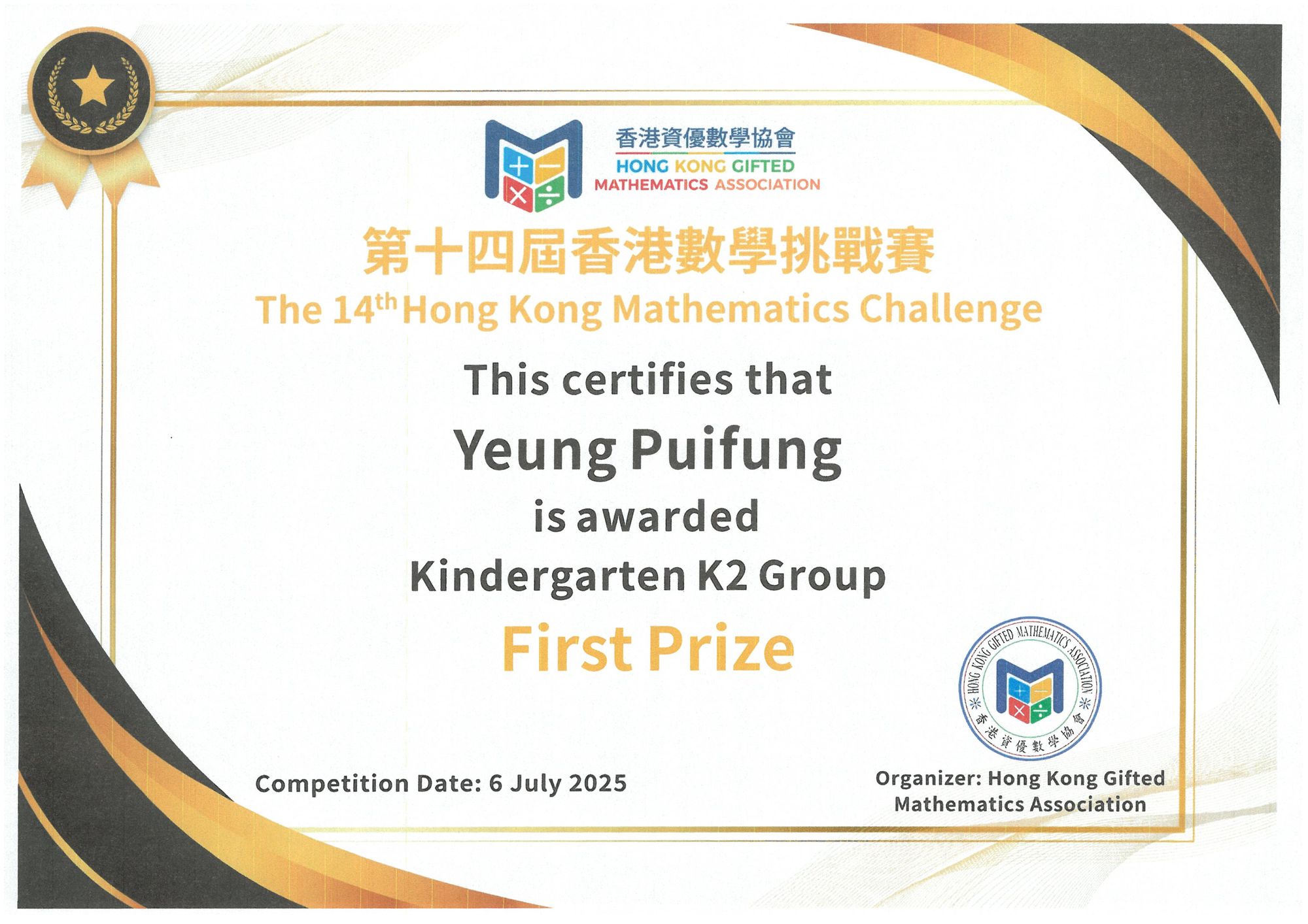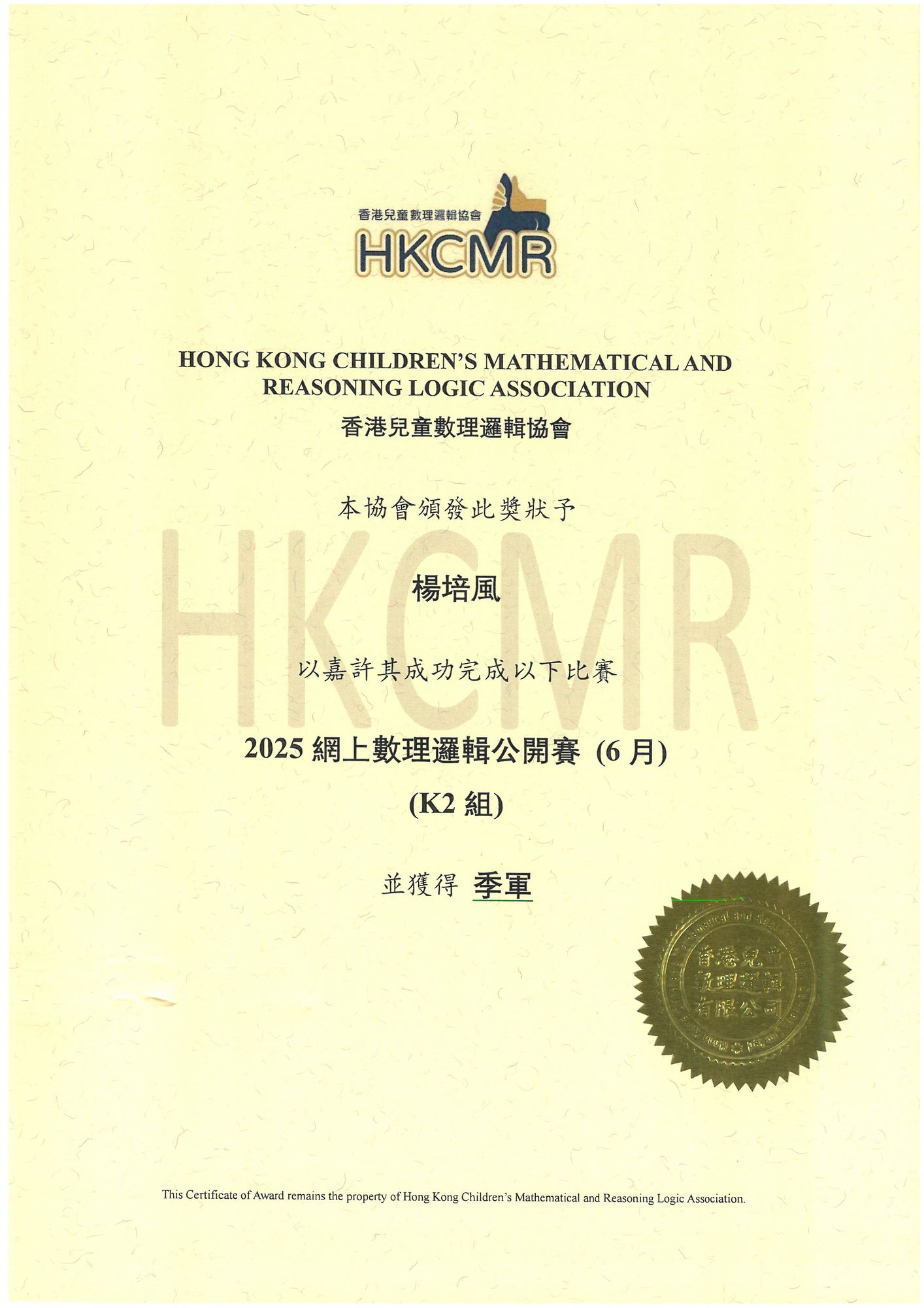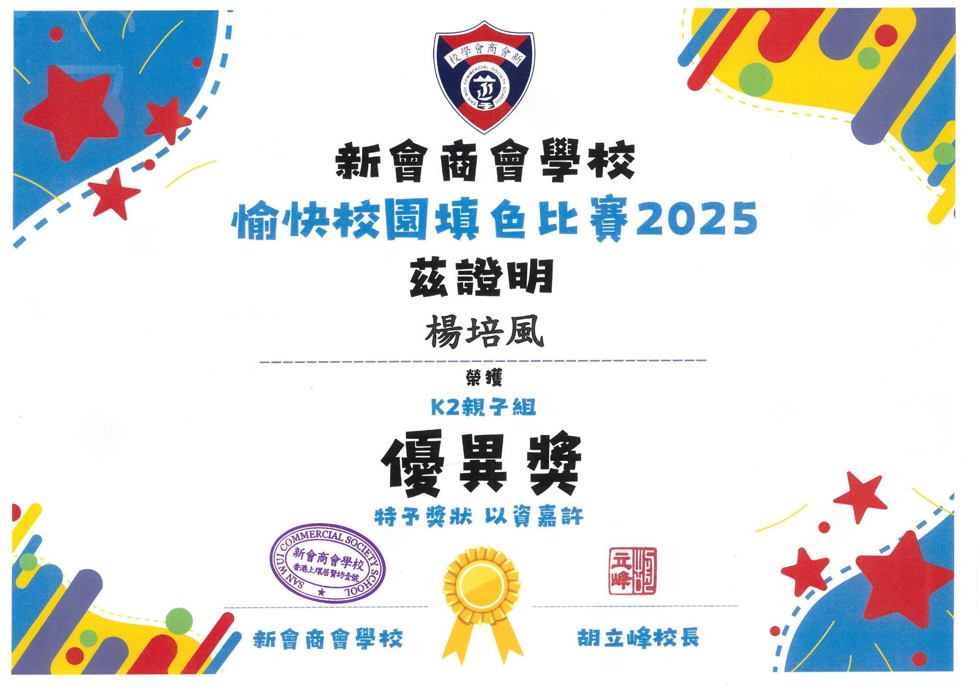 楊培風榮獲愉快校園填色比賽2025K2親子組季軍、2025網上數理邏輯公開賽(6月) (K2組) 獲得季軍、第十四屆香港數學挑戰賽Kindergarten K2 Group First Prize